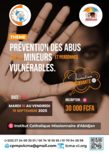 La première session de formation sur la prévention des abus sexuels. Celle-ci s’est tenue dans la période du mardi 13 septembre au mardi 20 septembre dernier dans les locaux de L’institut missionnaire Catholique (ICMA )
